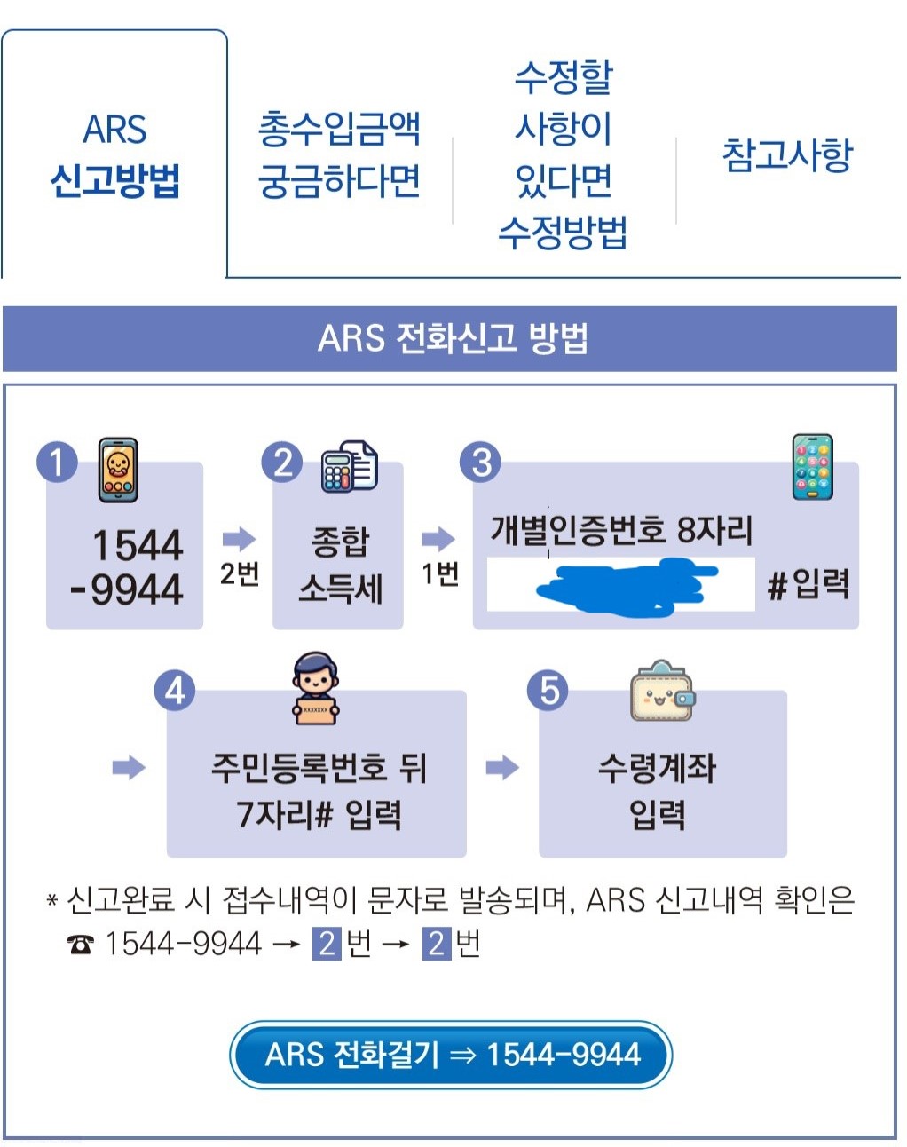 종합소득세 신고를 잘 모르고 어렵다고 생각이 드실 건데요. 세무서 방문이나 홈택스를 통해서 아니면 수수료를 지불하고 세무사 사무실에 의뢰하지 않고도 간단히 종합소득세 ARS전화 1544 - 9944로 전화하시면 간단하게 신고를 하실 수 있습니다.