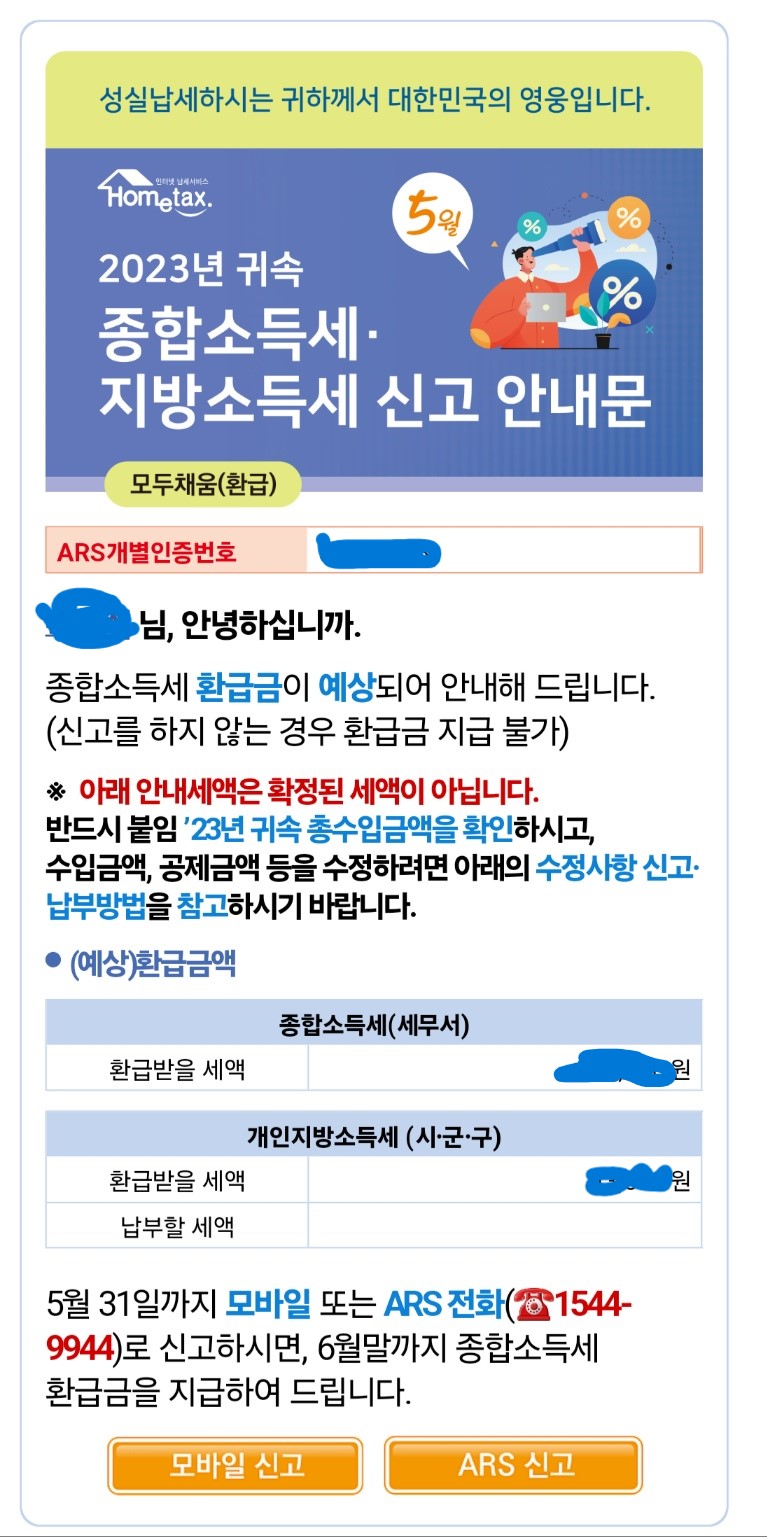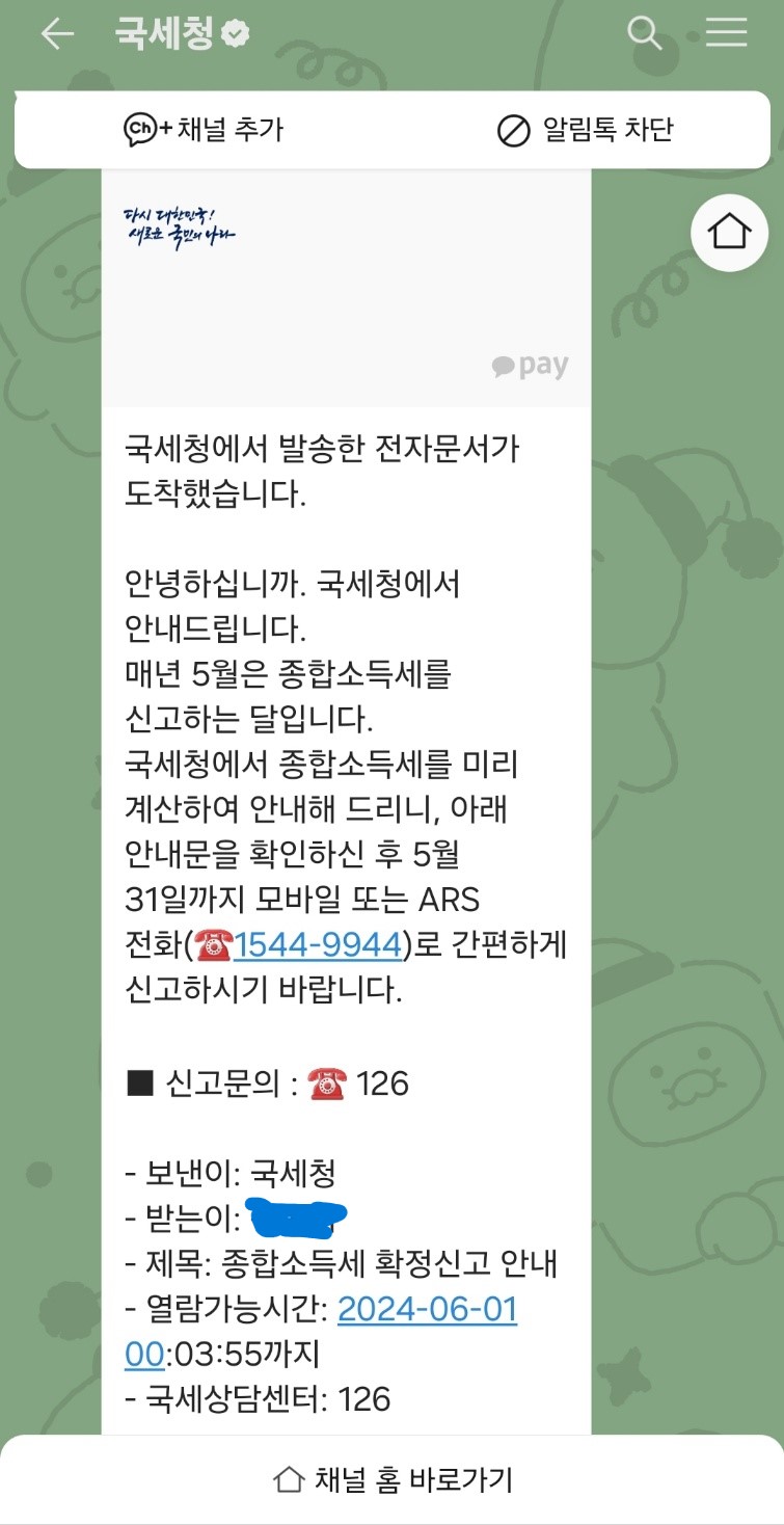 카카오톡으로 국세청에서 발송한 종합소득세 관련 문자를 확인합니다.